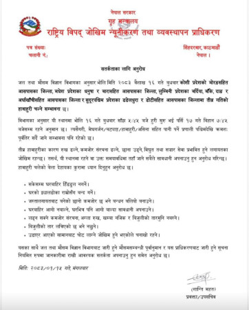 साथै, मौसमसम्बन्धी अद्यावधिक जानकारी नियमित रूपमा लिँदै सुरक्षित रहन पनि सबैमा आग्रह गरिएको छ।