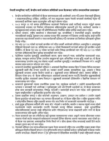 वैशाख १५,काठमाडौँ - नेपाली कम्युनिस्ट पार्टी केन्द्रीय कार्य संयोजन समितिको पहिलो बैठकले समसामयिक राजनीतिक, आर्थिक तथा सामाजिक विषयमा १९ बुँदे प्रस्ताव पारित गरेको छ।