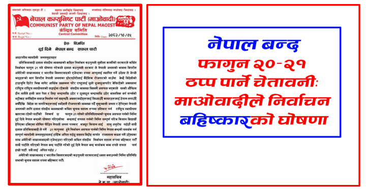 फागुन २०–२१ ठप्प पार्ने चेतावनी: माओवादीले निर्वाचन बहिष्कारको घोषणा