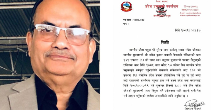मधेशका मुख्यमन्त्री सरोजकुमार यादवले दिए राजीनामा