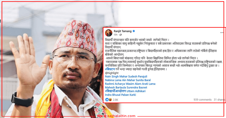 विद्यार्थी संगठनको निष्क्रियताप्रति रञ्जित तामाङको कडा टिप्पणी